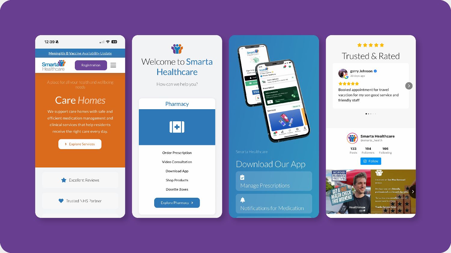 A “local” feel for a business with national ambition. The typography (Navigo) and visual treatment felt playful and small-business; Smarta needed a polished, professional aesthetic that matched the calibre of its NHS partnerships and B2B care home work.